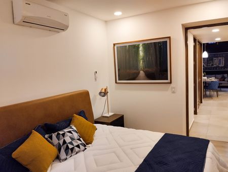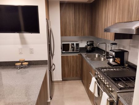 El condominio cuenta con 22 amenidades y áreas verdes. Los interiores incluyen pisos de cerámica y laminado tipo madera en terrazas, baños equipados con accesorios Castel, closets, cocina integral equipada, cortinas, luces LED y amplias ventanas exteriores. Las puertas tienen cerraduras de seguridad.